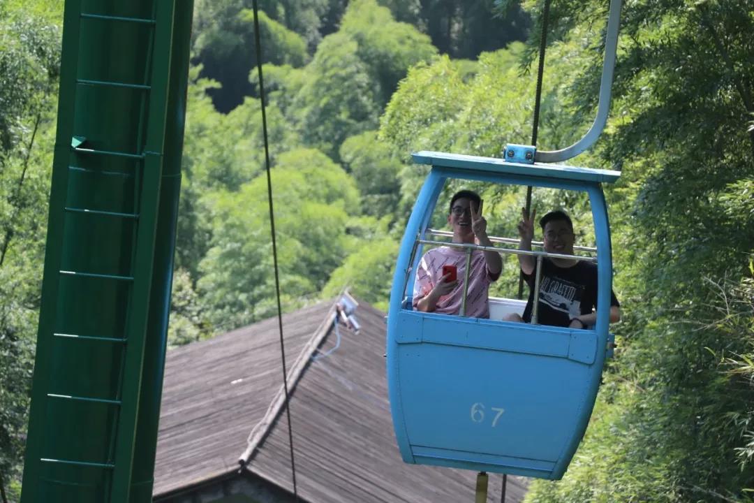 南山竹海一望無際的毛竹倚山抱石,千姿百態,形聲雄渾,情趣別致。上午全體員工乘坐小火車抵達壽星廣場,然后乘坐景區地面纜車穿梭在竹海中,登頂“吳越‘弟’一峰”。登頂后同事們拾級而下,沿途滿山遍坡長著粗圓挺拔的毛竹,路邊野花盛開,山澗的潺潺溪流和形態各異的竹木小屋,給全體員工以古樸、原始、自然的意境之感。
